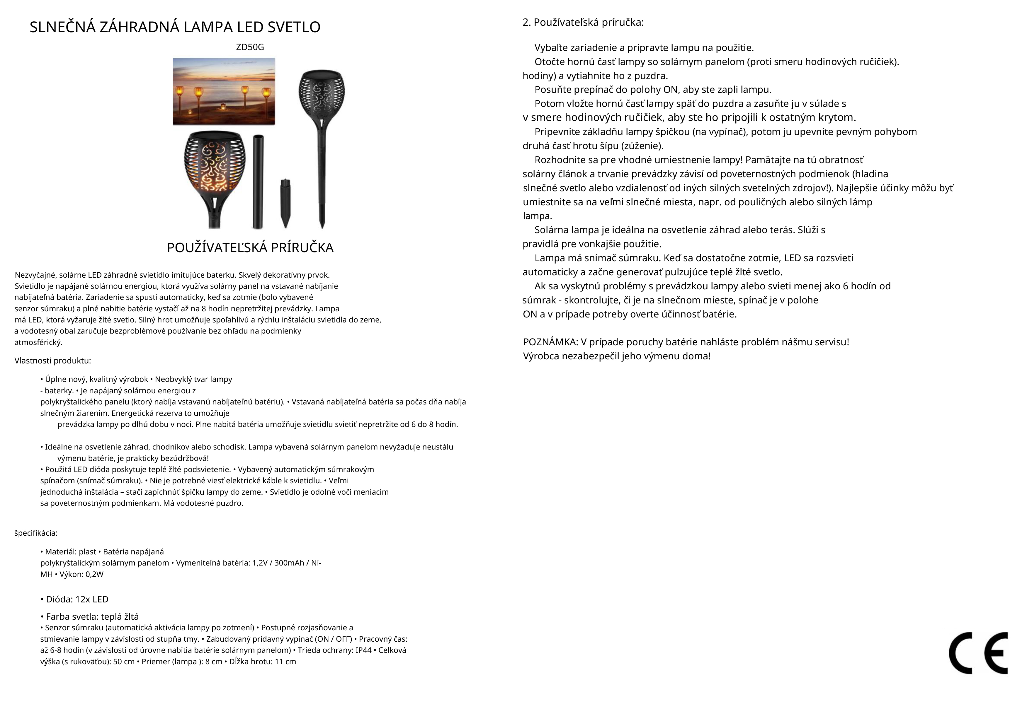 Nezvyčajné, solárne LED záhradné svietidlo imitujúce pochodeň. Skvelý dekoratívny prvok. Svietidlo je napájané solárnou energiou, ktorá využíva solárny panel na nabíjanie vstavanej nabíjateľnej batérie. Zariadenie sa automaticky spustí po zotmení (je vybavené senzorom súmraku) a plné nabitie batérie vystačí až na 8 hodín nepretržitej prevádzky. Lampa má LED, ktorá vyžaruje žlté svetlo. Silný hrot umožňuje spoľahlivú a rýchlu inštaláciu svietidla do zeme a vodotesné puzdro zaručuje bezproblémové používanie bez ohľadu na poveternostné podmienky.