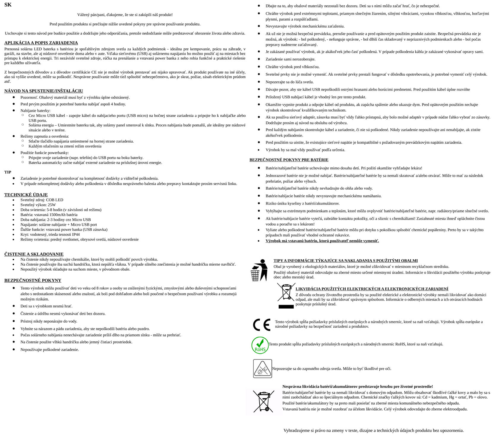 Pred prvým použitím baterku úplne nabijete cez USB alebo nechajte dobíjať na slnku.