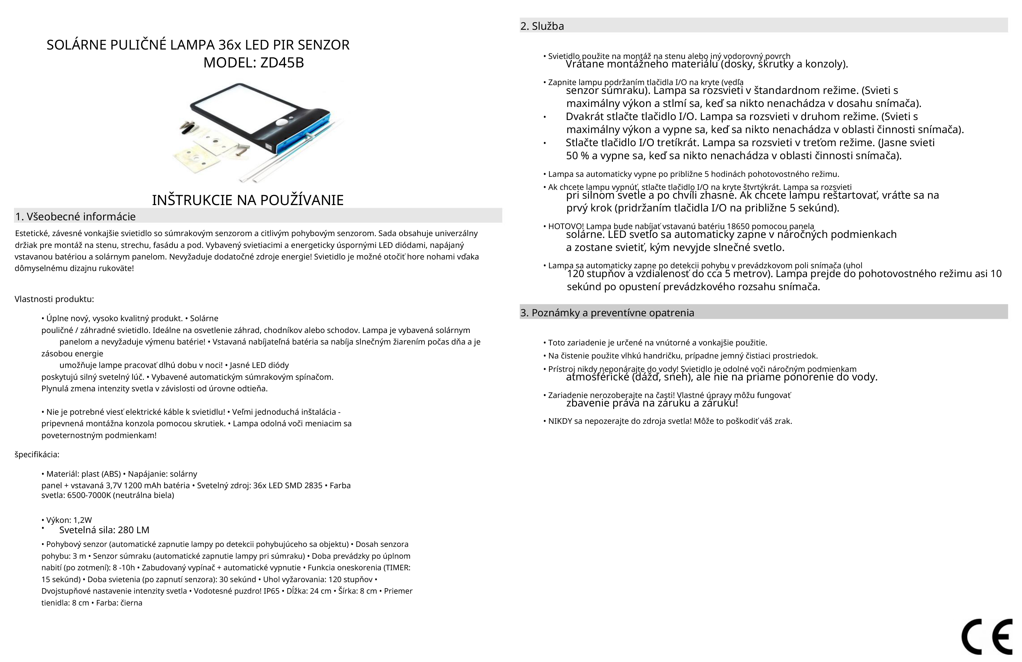 Estetické, závesné vonkajšie svietidlo so súmrakovým senzorom a citlivým pohybovým senzorom. Sada obsahuje univerzálny držiak pre montáž na stenu, strechu, fasádu a pod. Vybavený svietiacimi a energeticky úspornými LED diódami, napájaný vstavanou batériou a solárnym panelom. Nevyžaduje dodatočné zdroje energie! Svietidlo je možné otočiť hore nohami vďaka dômyselnému dizajnu rukoväte!
