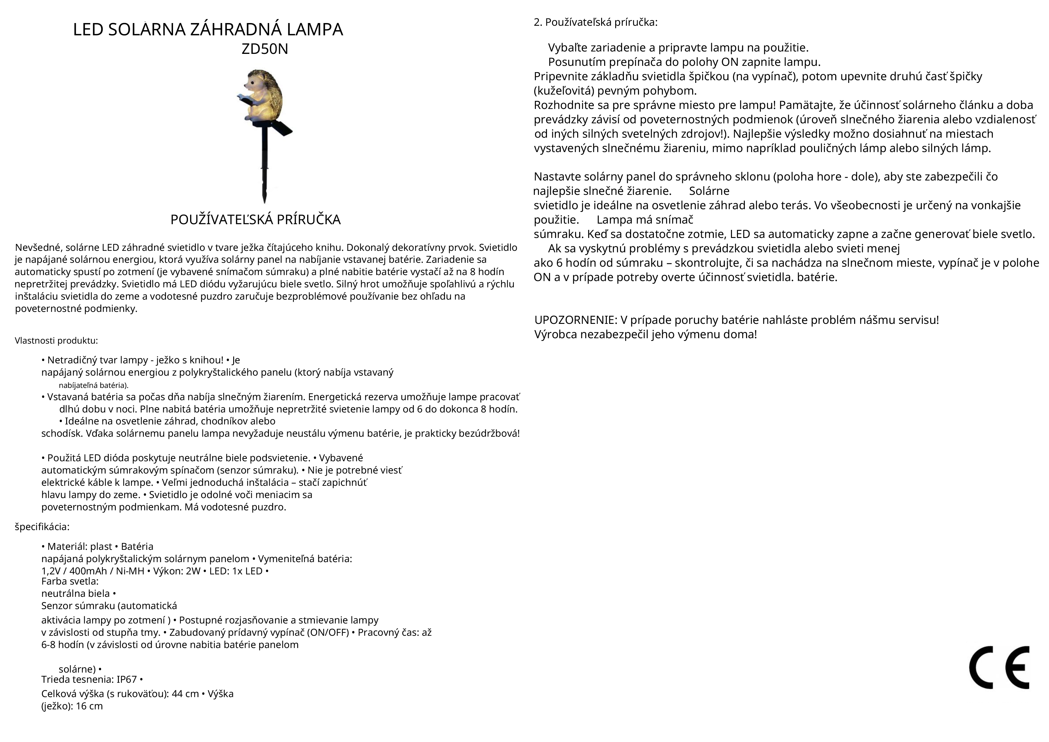 Má zabudované LED svetlo napájané solárnou batériou. Automaticky sa zapne v noci a vypne počas dňa, aby sa dobilo.