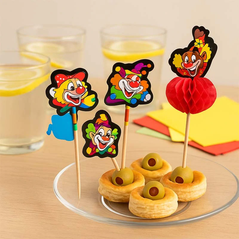 Tieto dekoratívne špajle s klaunskými motívmi sú praktickým a zároveň estetickým doplnkom pre akékoľvek spoločenské podujatie. Sú vyrobené z kvalitného dreva a majú potravinársky atest, takže sú úplne bezpečné pri kontakte s jedlom. Každá špajla má na vrchu veselú papierovú postavičku klauna – niektoré s 3D skladaným ozdobným prvkom – vďaka čomu sa dokonale hodia ako ozdoba do slaných pochúťok, mini sendvičov, zákuskov alebo ovocných misiek.
