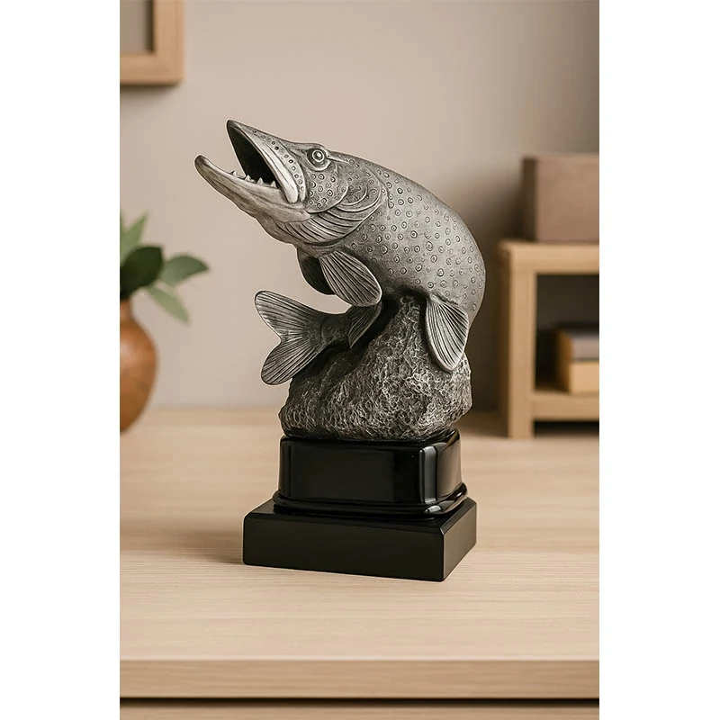 Jedinečná, odlievaná rybárska soška znázorňujúca šťuku. Ryba a ďalšie prvky odliatku dodávajú celku jedinečný charakter a vďaka elegantným farbám sa bude skvele vynímať na poličke s trofejami. To je skvelý nápad na individuálne uznanie na rybárskych pretekoch, napr. za najväčšiu ulovenú rybu.