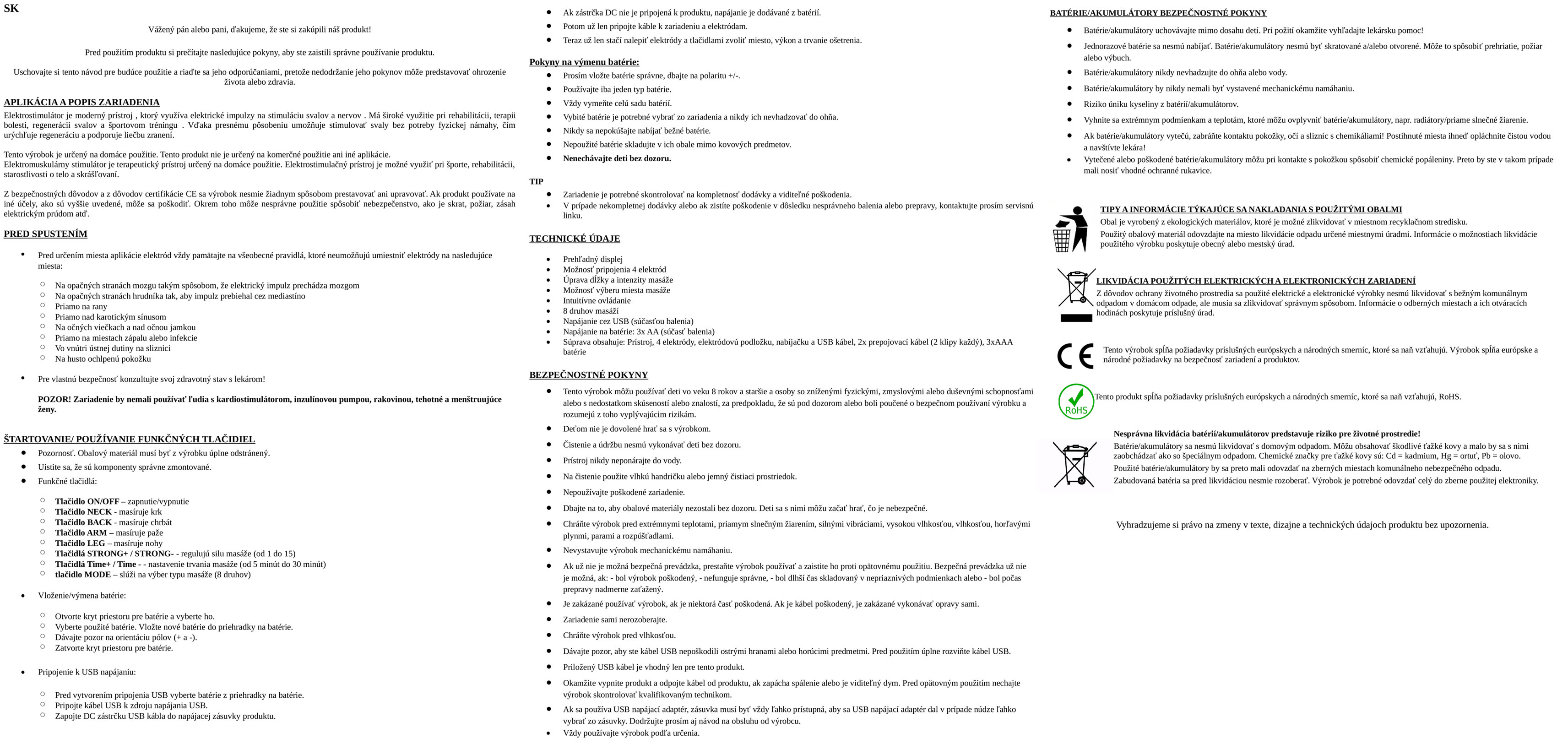 Obsah balenia: prístroj, napájací kábel, 3× batérie, 2 prepojovacie káble, podložka na elektródy