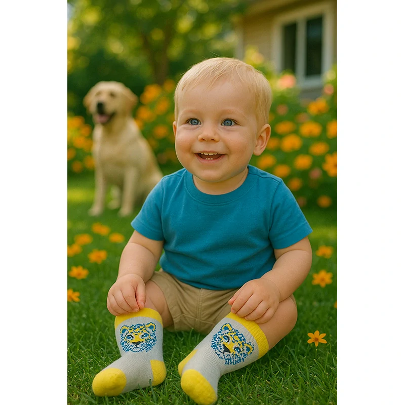Detské bavlnené ponožky sú vyrobené z vysoko kvalitnej bavlnenej priadze.. Sú veľmi príjemné na dotyk a pohodlné. Majú ploché švy s nesťahujúcim a protisklzovým lemom. Pevne držia a zároveň sa nezarezávajú do pokožky.