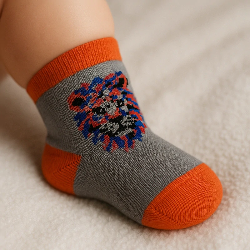 Detské bavlnené ponožky sú vyrobené z vysoko kvalitnej bavlnenej priadze. Sú veľmi príjemné na dotyk a pohodlné. Majú ploché švy s nesťahujúcim a protisklzovým lemom. Pevne držia a zároveň sa nezarezávajú do pokožky.