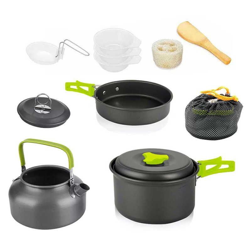 Kompletná sada turistického riadu, pozostávajúca až z 10 prvkov. Ideálne na kempovanie a výlety. Hrniec, panvica a naberačka majú zložené rukoväte, vďaka čomu sa dajú ľahko skladať a prenášať. Priestranná kanvica s rukoväťou a pokrievkou vám umožní uvariť vodu na kávu alebo čaj. Sú vyrobené z hliníka (hrnec, panvica, rýchlovarná kanvica a pokrievky), ktorý zaisťuje vysokú odolnosť a zabraňuje prilepeniu jedla. Možnosť zloženia a pohodlného uloženia v priloženej taške so sťahovacou šnúrkou.
