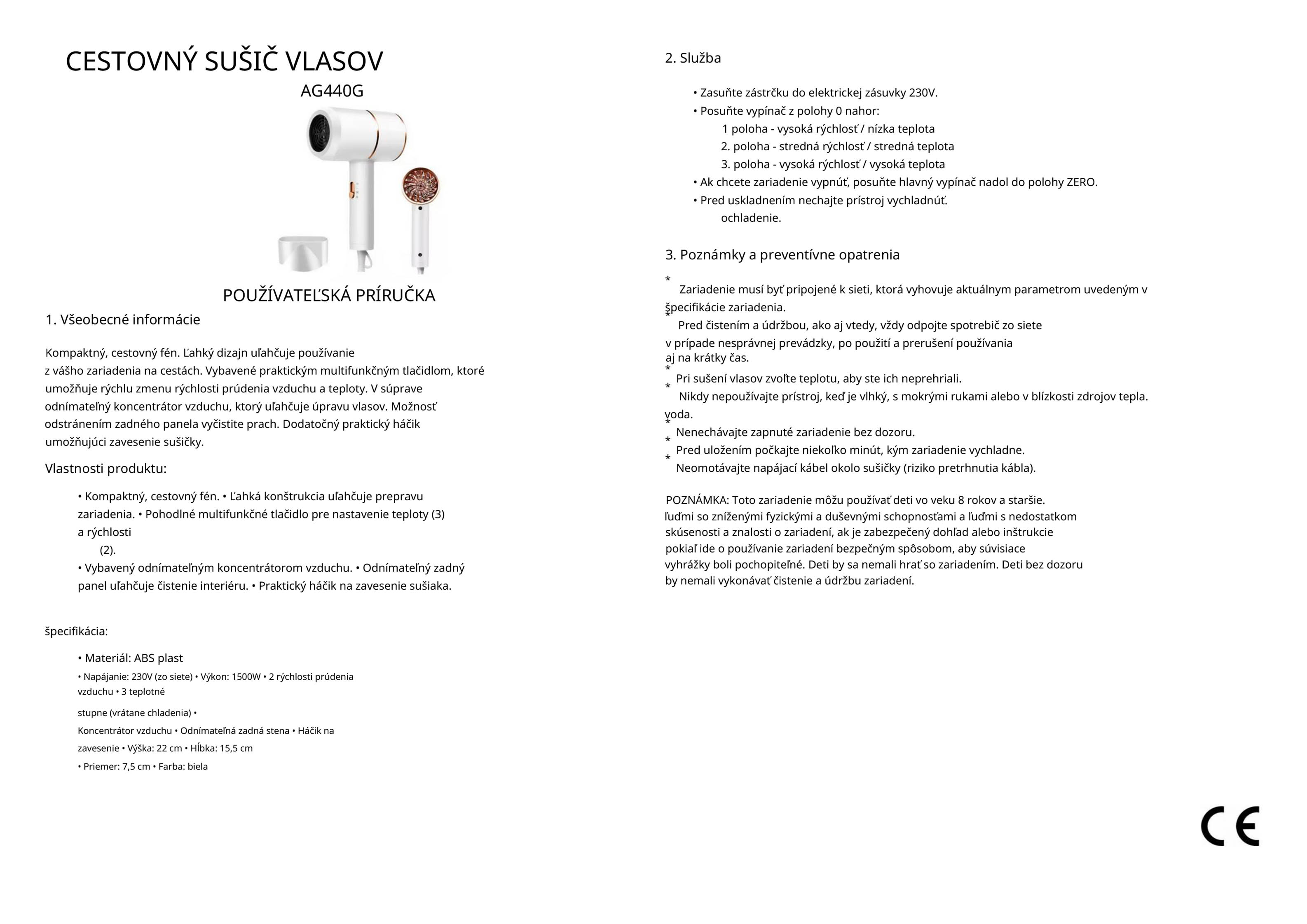 - Turistický fén na vlasy 730W biely