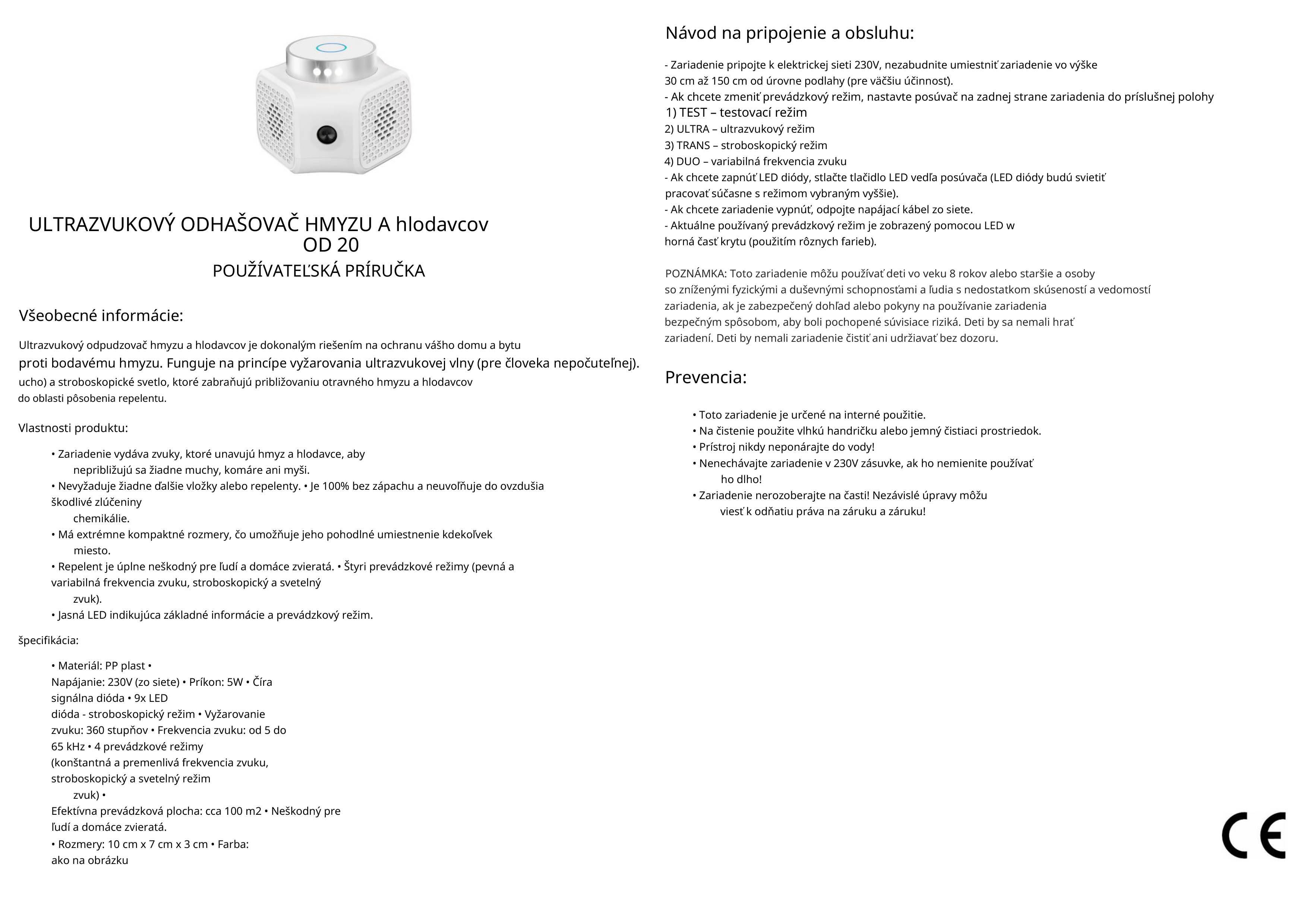 Ultrazvukový odpudzovač hmyzu a hlodavcov je dokonalým riešením na ochranu vášho domu a bytu pred nepríjemným hmyzom. Funguje na princípe vyžarovania ultrazvukovej vlny (ľudským uchom nepočuteľnej) a stroboskopického svetla, ktoré zabraňujú otravnému hmyzu a hlodavcom priblížiť sa k pôsobisku repelentu.