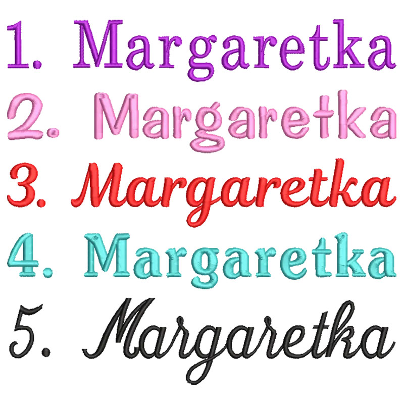 Vyšívame meno, prípadne text do veľkosti 120x90 mm. Výšivka bude teda široká 120 mm, v závislosti od množstva vyšívaného textu sa veľkosť jednotlivých písmen mení tak, aby sa text zmestil na pracovnú plochu (čím viac textu, tým menšie písmeno bude)