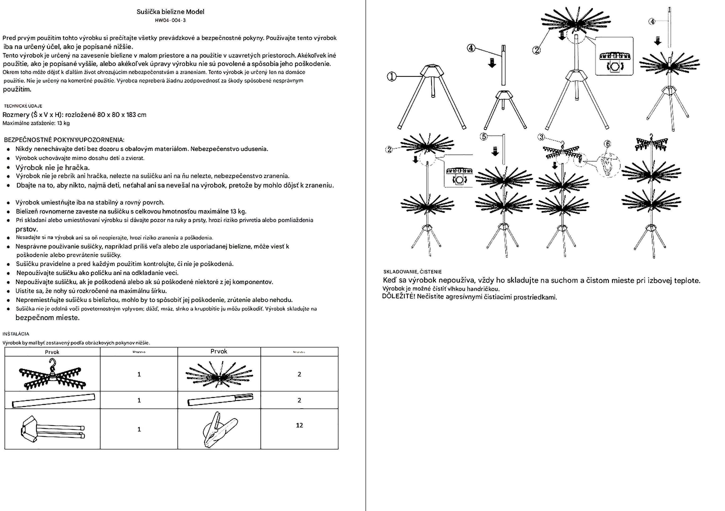 Základná montáž je jednoduchá a nevyžaduje špeciálne náradie. Sušiak sa dá rýchlo rozložiť aj zložiť.