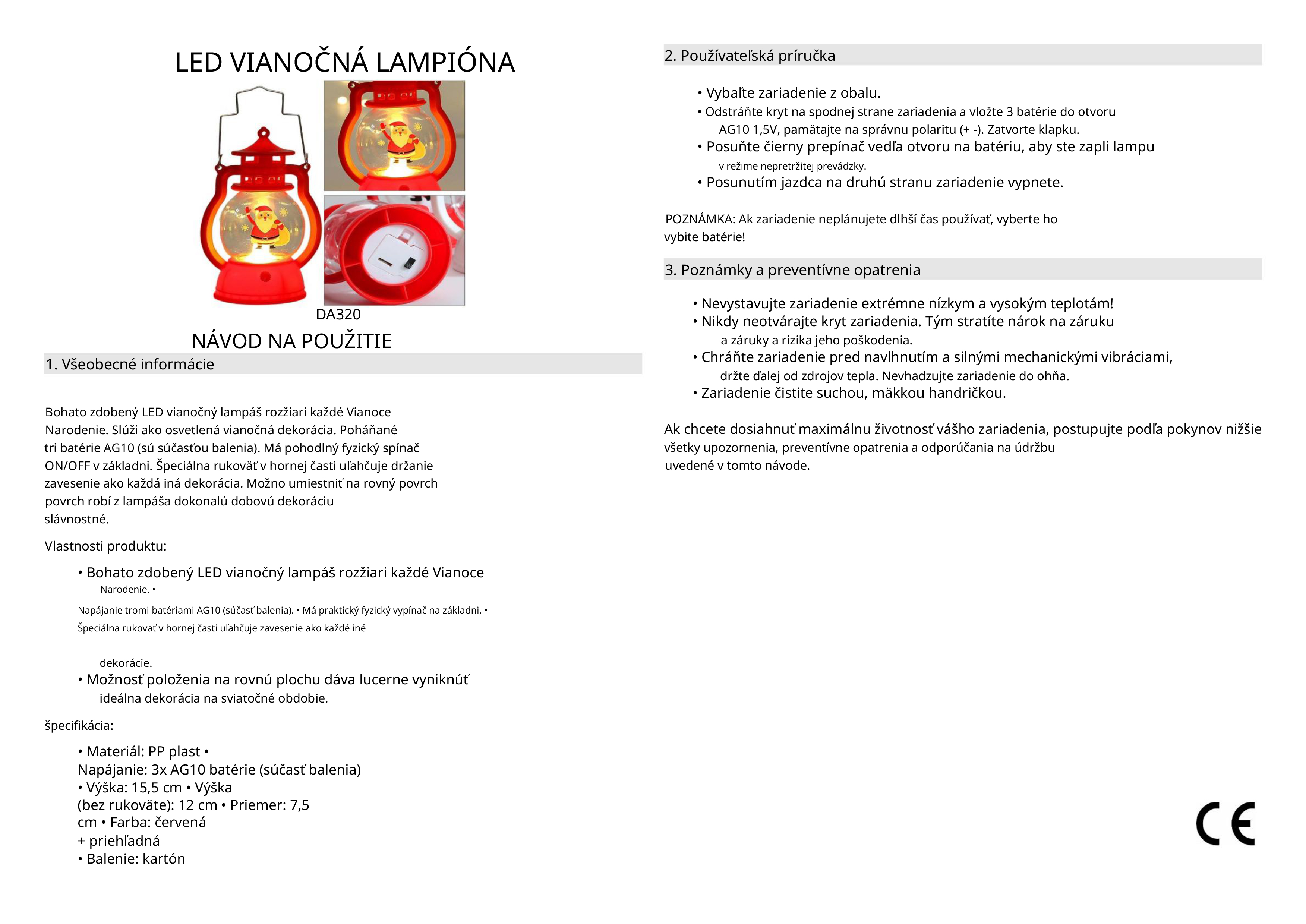 Bohato zdobený LED vianočný lampáš rozžiari každé Vianoce. Slúži ako svietiaca vianočná dekorácia. Napájanie tromi batériami AG10 (súčasťou balenia). Má praktický fyzický vypínač na základni. Špeciálna rukoväť v hornej časti uľahčuje zavesenie ako akúkoľvek inú dekoráciu. Možnosť položenia na rovnú plochu robí z lampáša dokonalú dekoráciu na sviatočné obdobie.