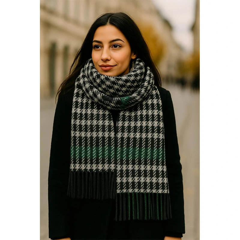 Vzorovaný šál so strapcami, zelený/čierny/biely: 180×60 cm - unisex