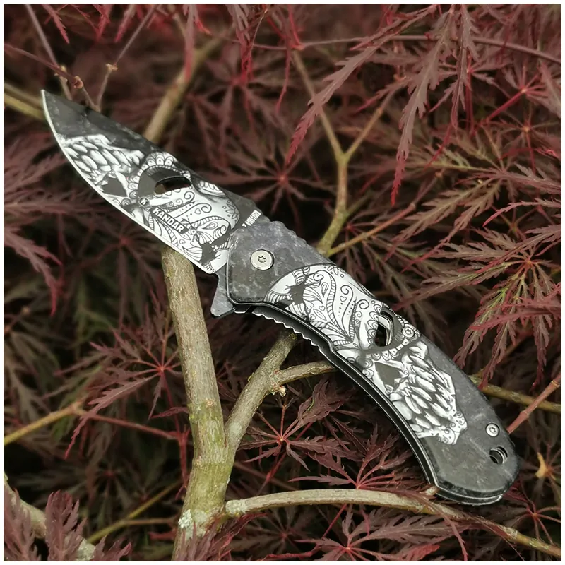 Nôž má automaticky otvárateľnú čepeľ, ktorú otvárate jednoduchým zatiahnutím kolíka ukazovákom. Ergonomicky tvarovaná rúčka chráni dlaň pred zošmyknutím na čepeľ. Na rúčke je kovová spona, ktorou si môžete nôž pripevniť k opasku alebo inej časti oblečenia.