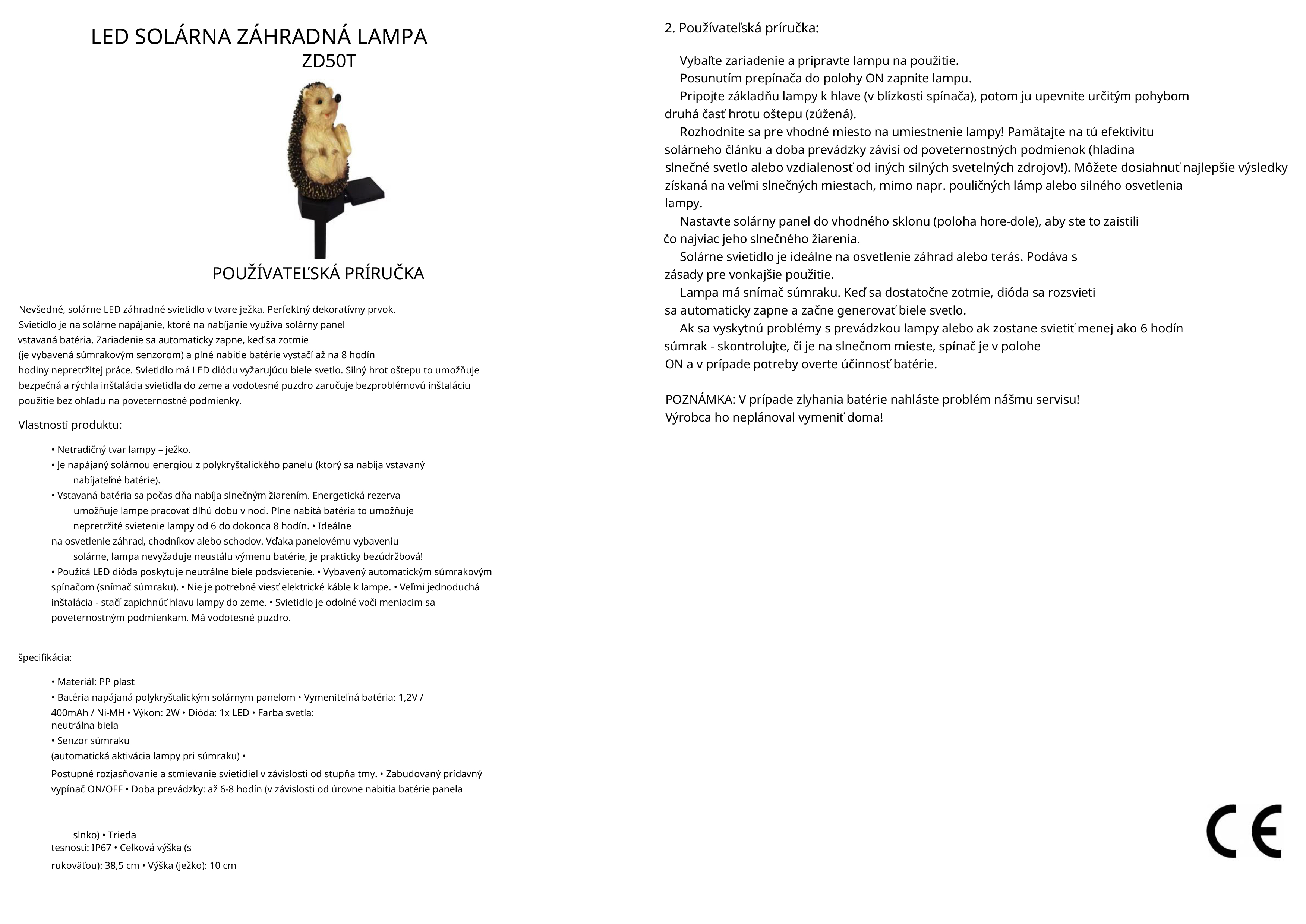 Táto záhradná solárna lampa v tvare ježka zaujme na prvý pohľad svojím netradičným dizajnom. Kombinuje estetiku a funkčnosť – cez deň sa nenápadne nabíja pomocou slnečného žiarenia a večer automaticky rozsvieti teplým bielym svetlom. Vďaka praktickému zápichu ju jednoducho umiestniš do zeme tam, kde práve potrebuješ jemné osvetlenie a príjemnú atmosféru.