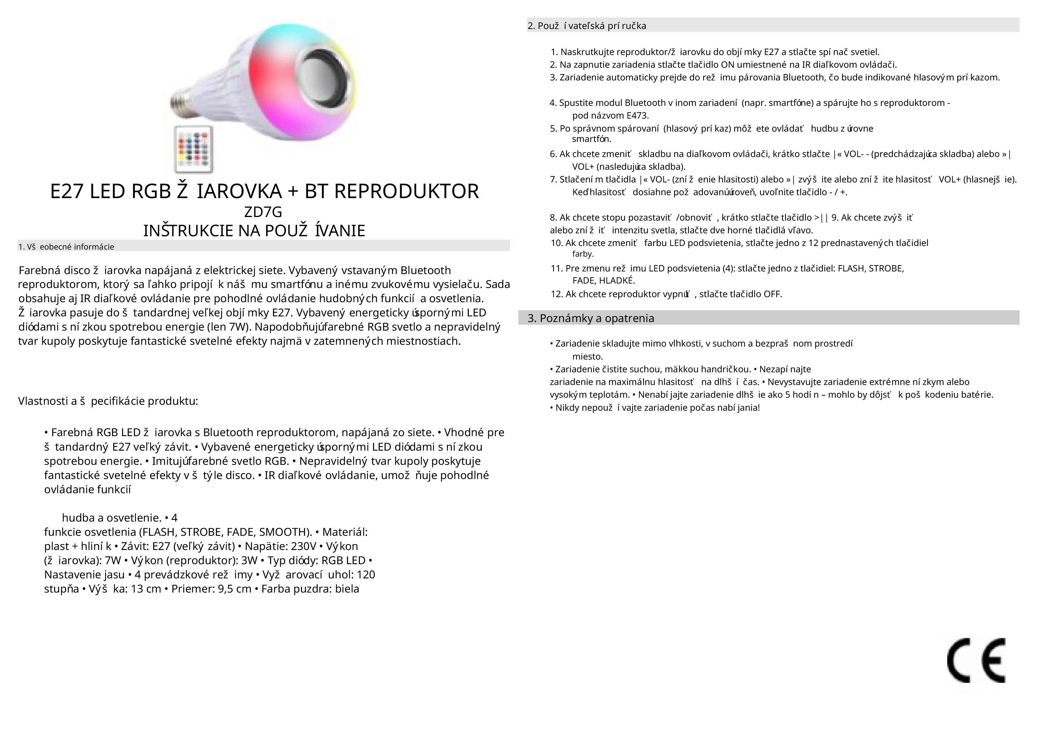 Farebná disco žiarovka napájaná z elektrickej siete. Vybavená vstavaným Bluetooth reproduktorom, ktorý sa ľahko pripojí k vášmu smartfónu a inému zvukovému vysielaču. Sada obsahuje aj IR diaľkové ovládanie pre pohodlné ovládanie hudobných funkcií a osvetlenia. Žiarovka pasuje do štandardnej veľkej objímky E27. Vybavená energeticky úspornými LED diódami s nízkou spotrebou energie (iba 7W). Napodobňujú farebné RGB svetlo a nepravidelný tvar žiarovky poskytuje fantastické svetelné efekty najmä v zatemnených miestnostiach.