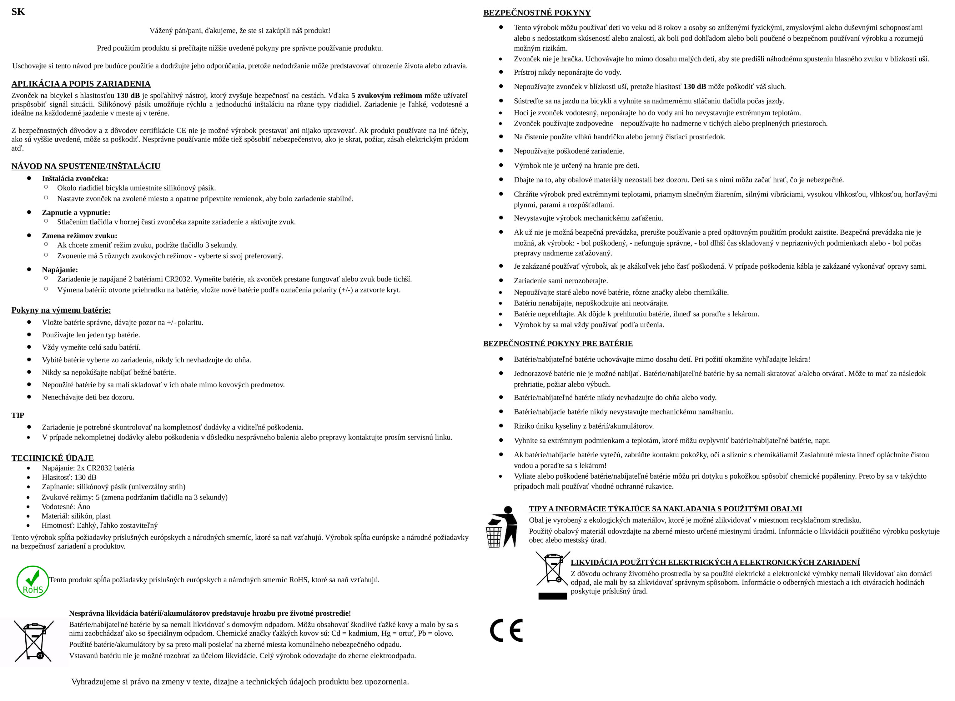 Klaksón je dostatočne hlasný, aby upútal pozornosť ostatných účastníkov cestnej premávky a upozornil ich na vašu prítomnosť. Napájanie pomocou dvoch batérií CR 2032.